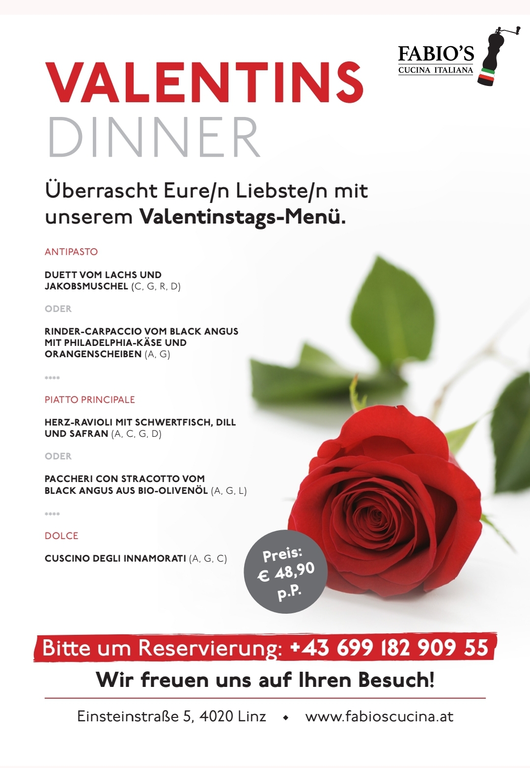 Werfen Sie schon jetzt einen Blick in unsere Speisekarte und lassen Sie sich Appetit auf Ihren Besuch bei Fabio's Cucina Italiana machen. Alle Gerichte genießen Sie direkt in unserem italienischen Restaurant in Linz Urfahr und Umgebung oder bestellen Sie Ihre Lieblingsspeisen bequem zur Abholung – frisch zubereitet für den Genuss zu Hause.